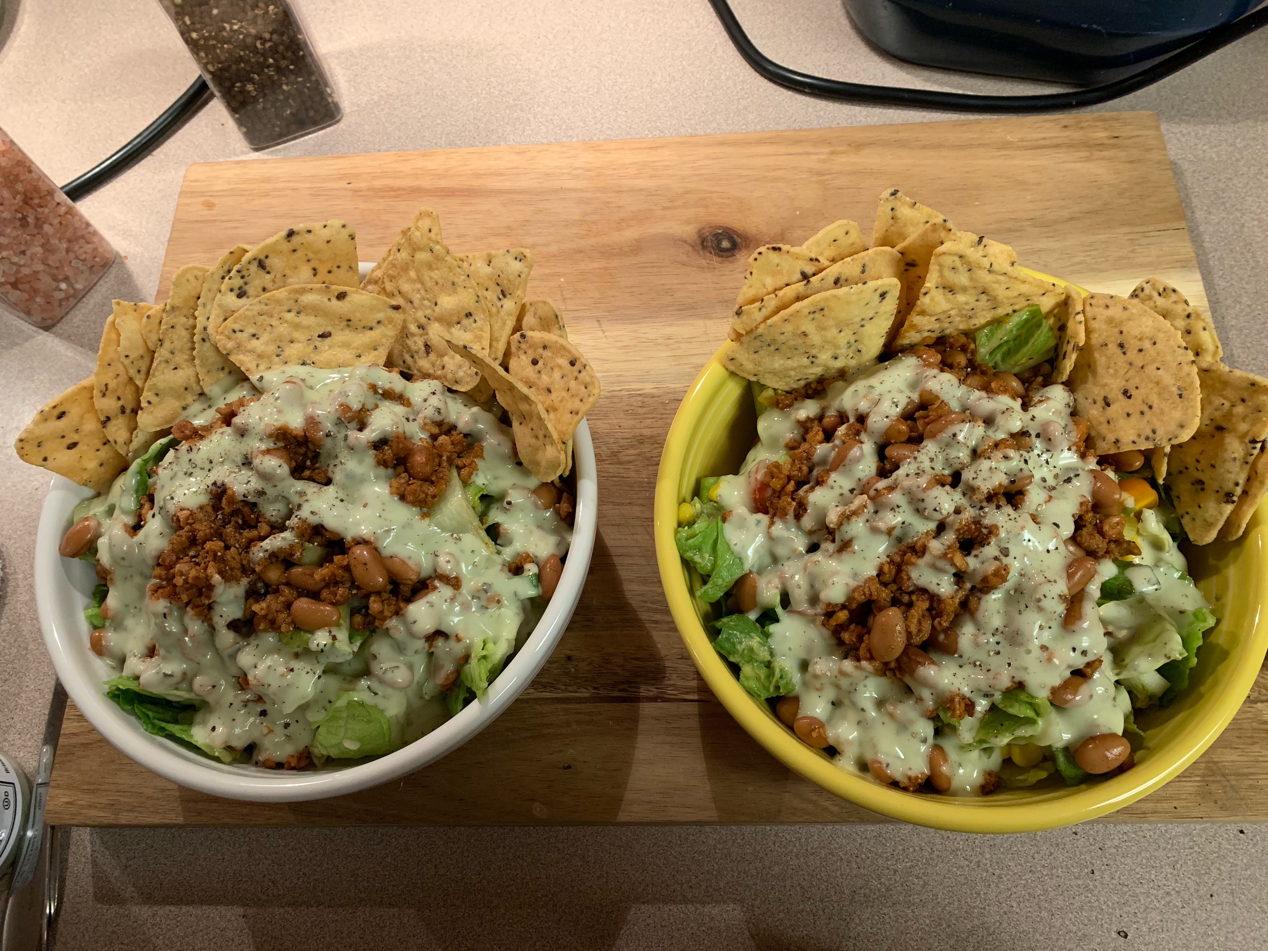 Plant based taco salad was on the menu this week and it was delicious! So easy to make, I used 1 can of organic pinto beans-rinsed and 1 pkg of Gardein Beetles Crumbles. I used my favorite organic taco seasoning but you can use any you like or just spice it up yourself! Salad was romaine lettuce, mini heirloom tomatoes, fresh corn, avocado, green onions, jalapeño and topped with cilantro lime dressing. I used a basic lemon tahini dressing replacing lemon juice with lime and adding cilantro, 1/4 an avocado and almond milk to thin! Chips on the side are Late July Snacks Sea Salt by the seashore multigrain tortilla chips-so delicious, organic, gluten free, non gmo made with chia, flax, millet, quinoa and amaranth! This will be a summer favorite I can tell, next time I will grill the corn and avocado!